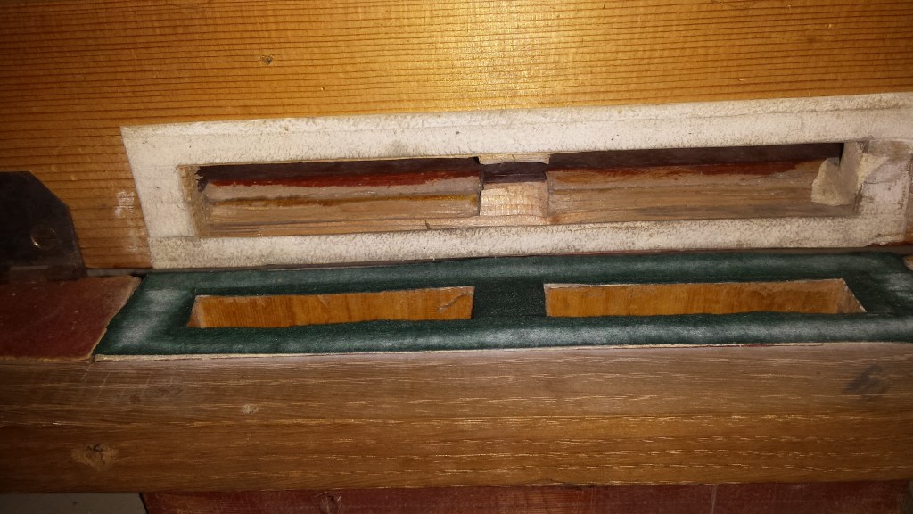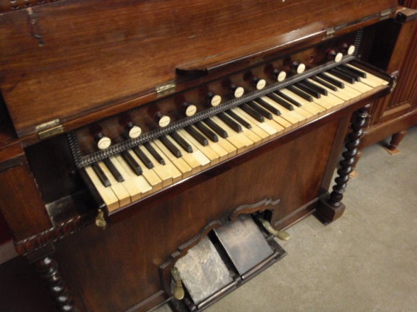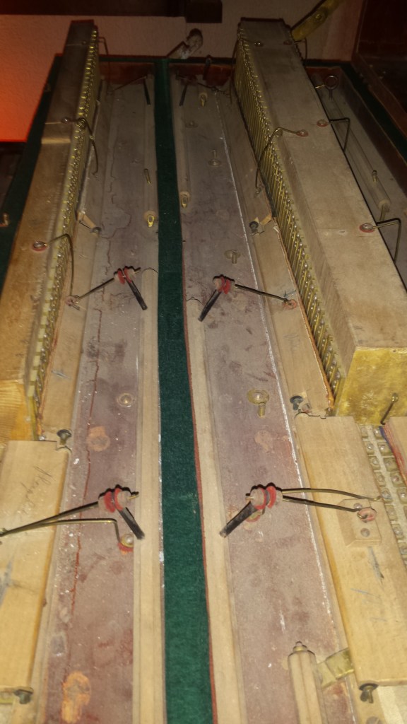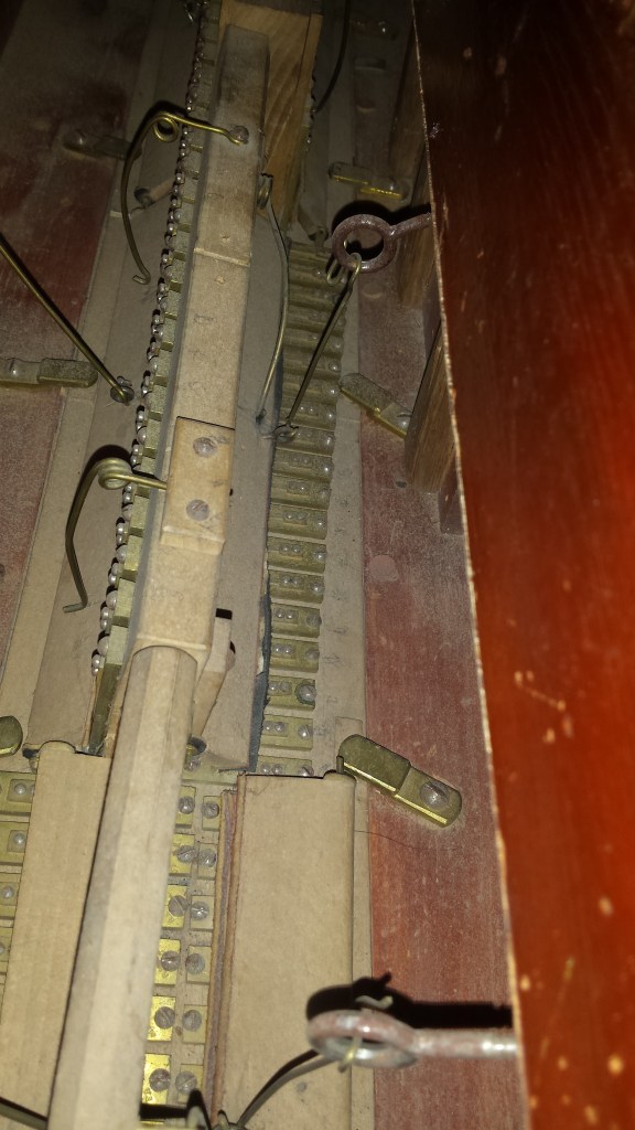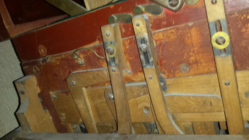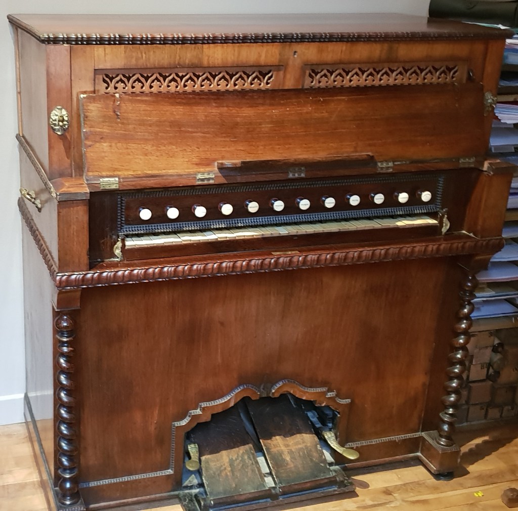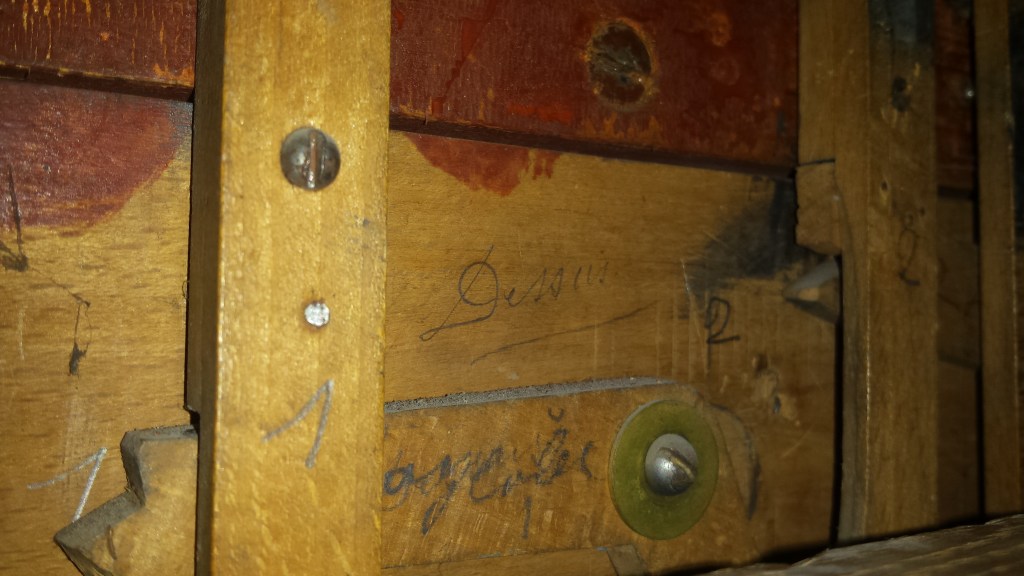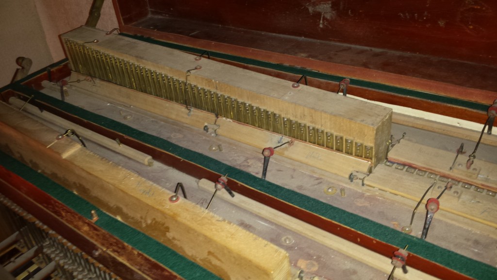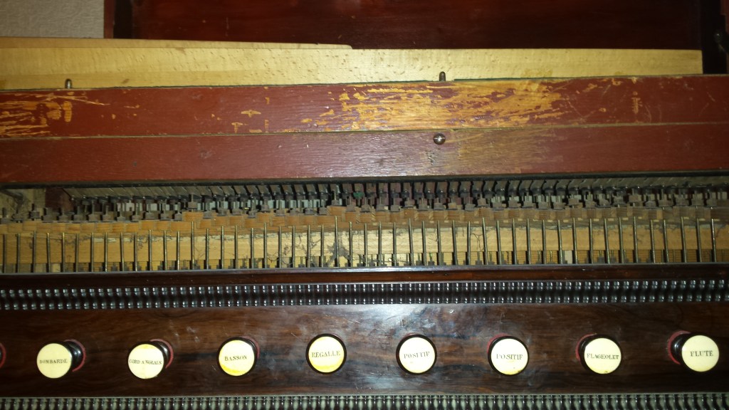 Orgue 5 jeux répartis sur deux sommiers imbriqués l’un au-dessus de l’autre sur le principe GO / Positif intérieur d’un orgue à tuyaux du XIXème siècle.