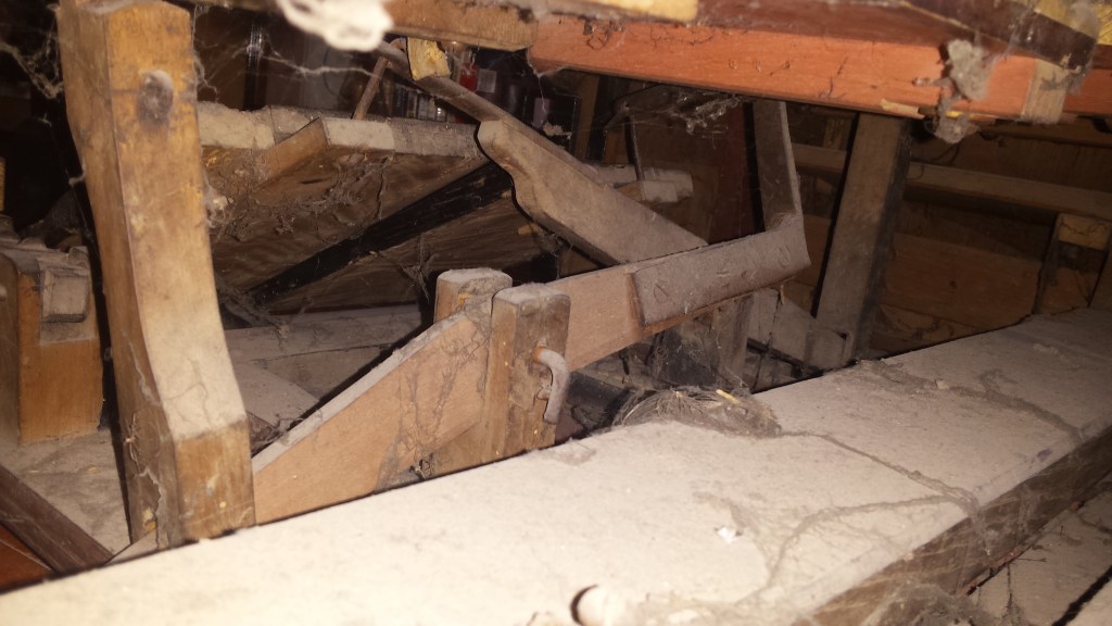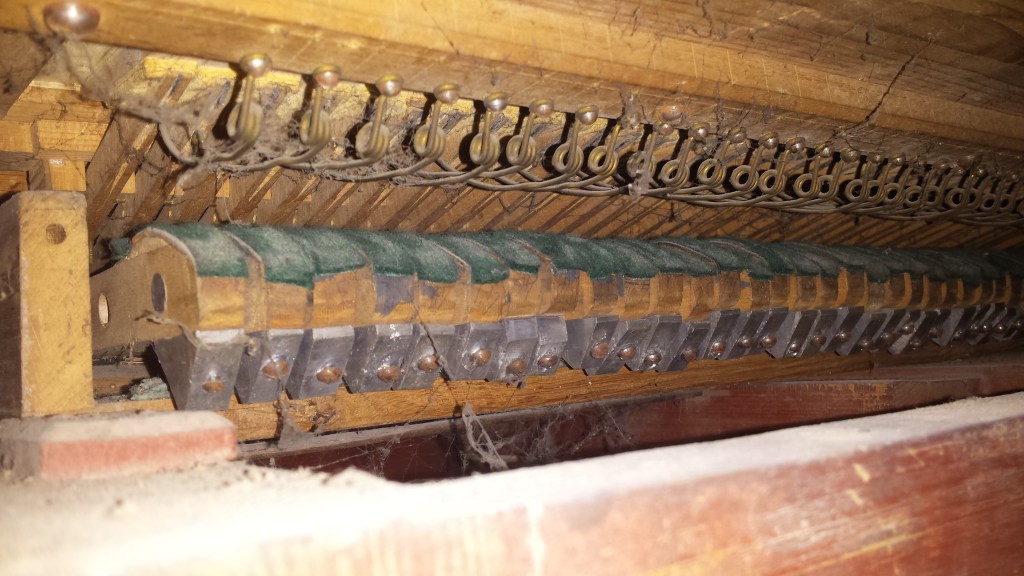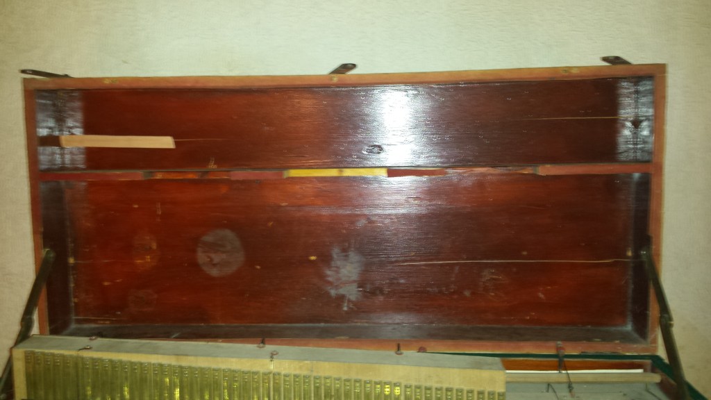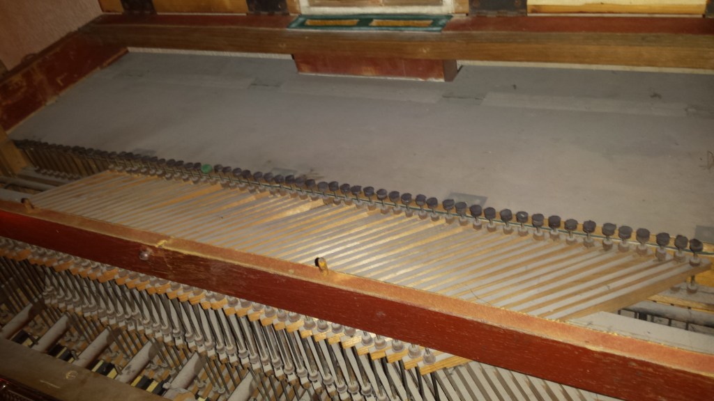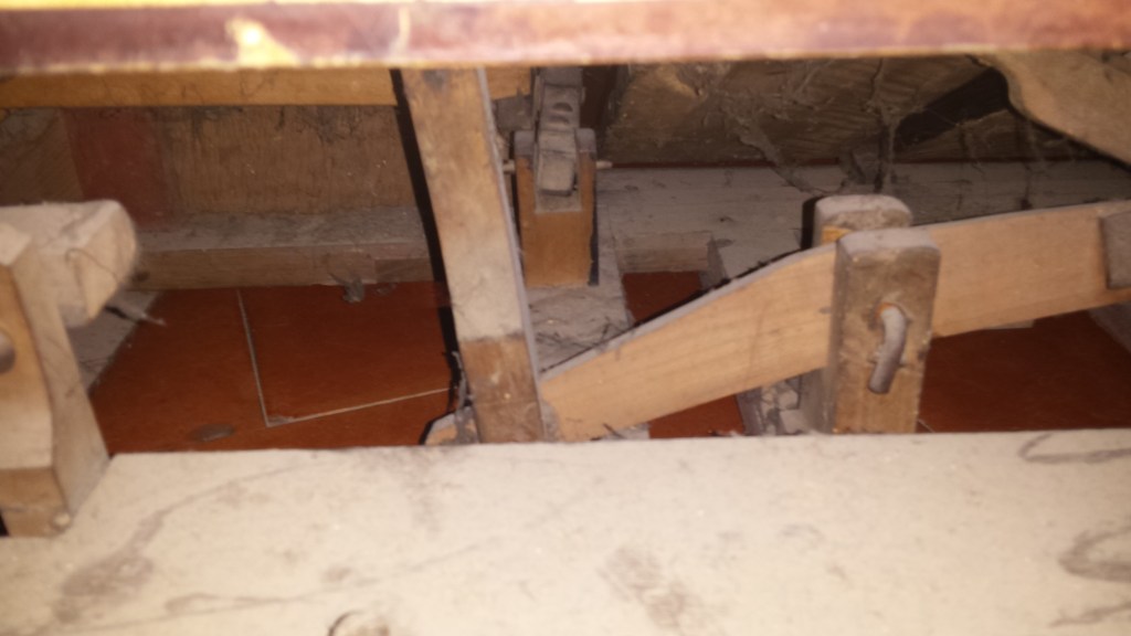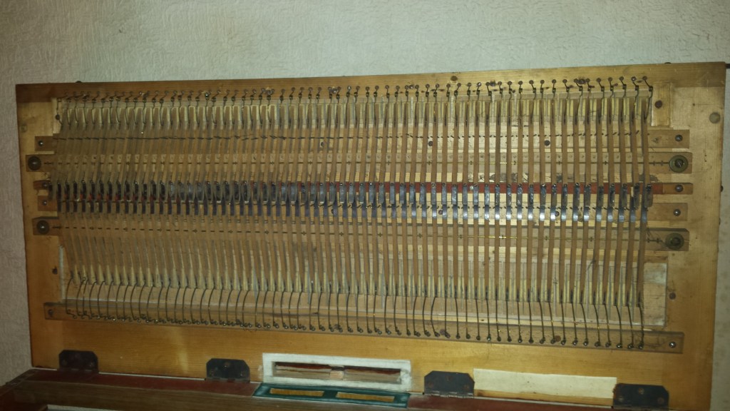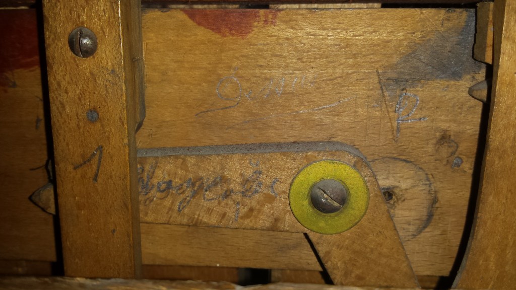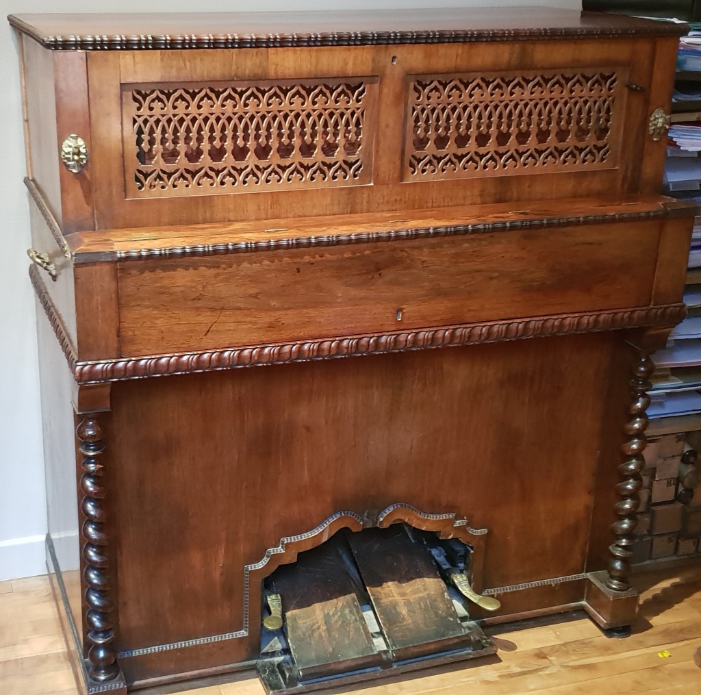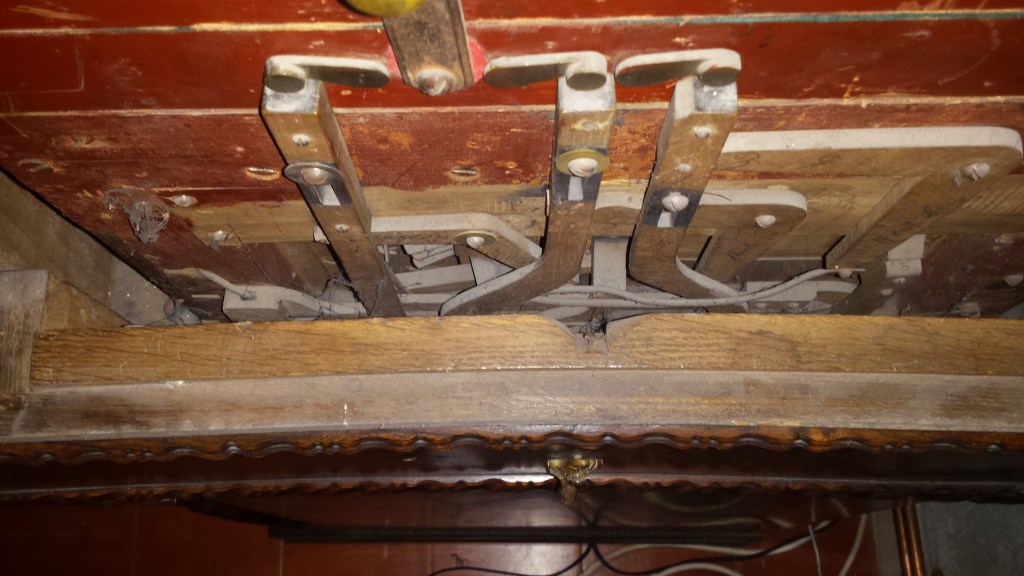 Orgue 5 jeux répartis sur deux sommiers imbriqués l’un au-dessus de l’autre sur le principe GO / Positif intérieur d’un orgue à tuyaux du XIXème siècle.