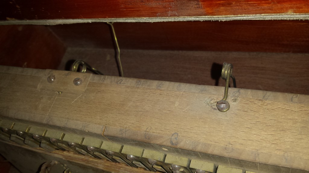 Composition: accouplement G / bombarde* / cord anglais* (sic) / basson* / régale** / positif** / positif** / flageolet* / flute* / haut-bois* / clarinette* / accouplement A