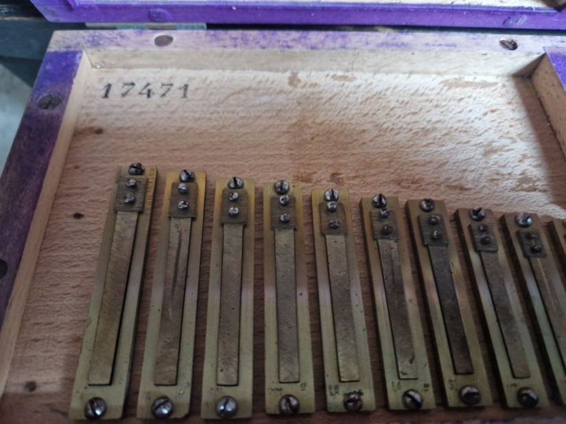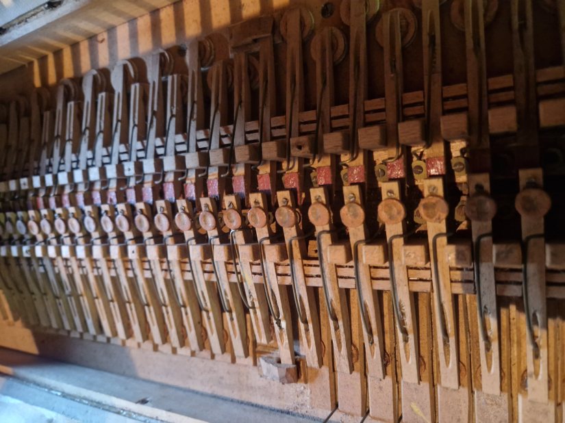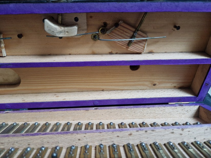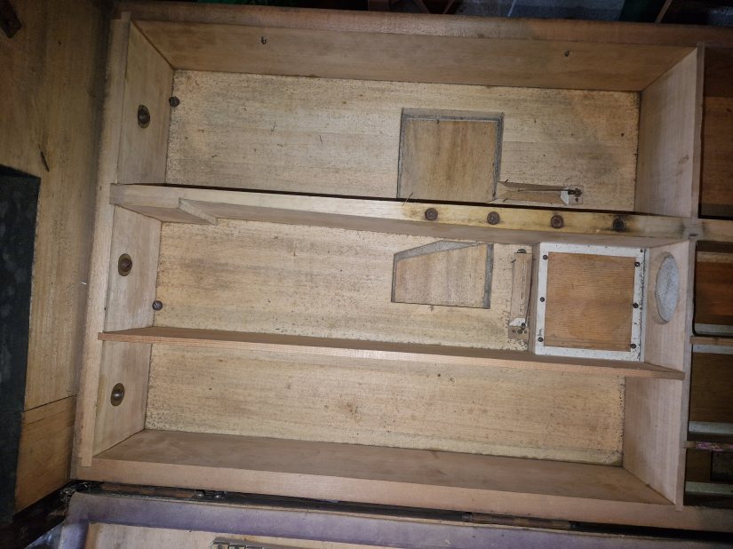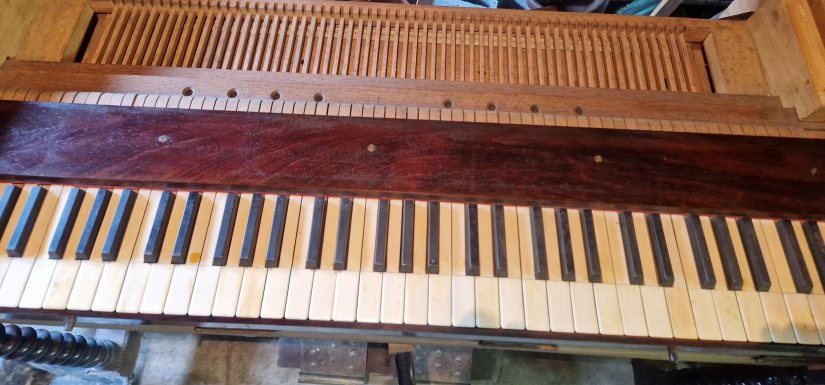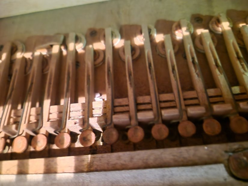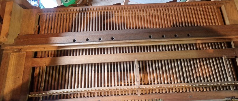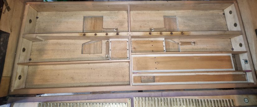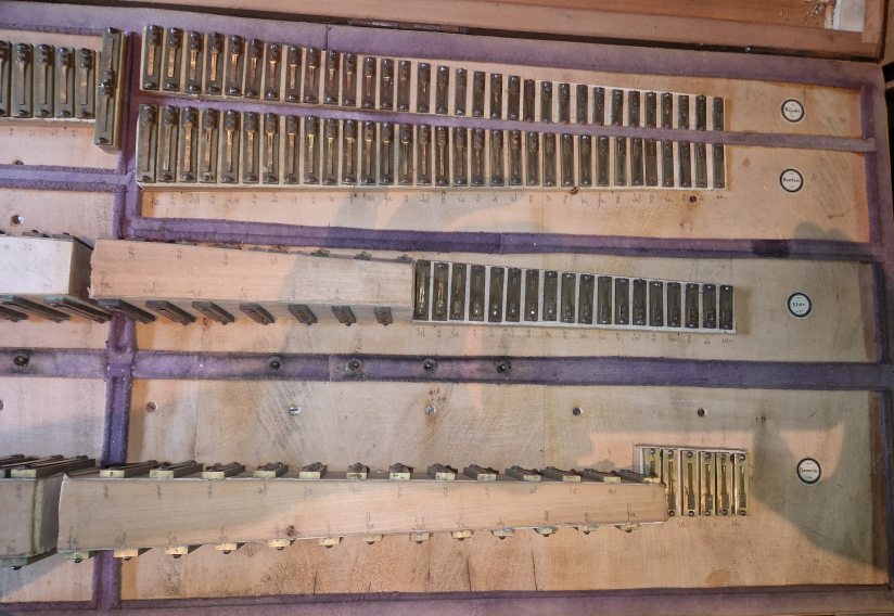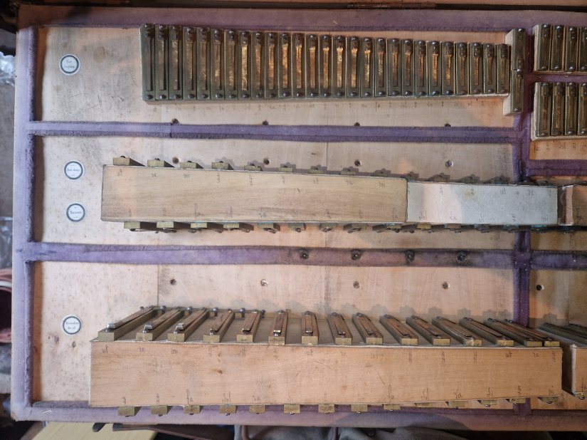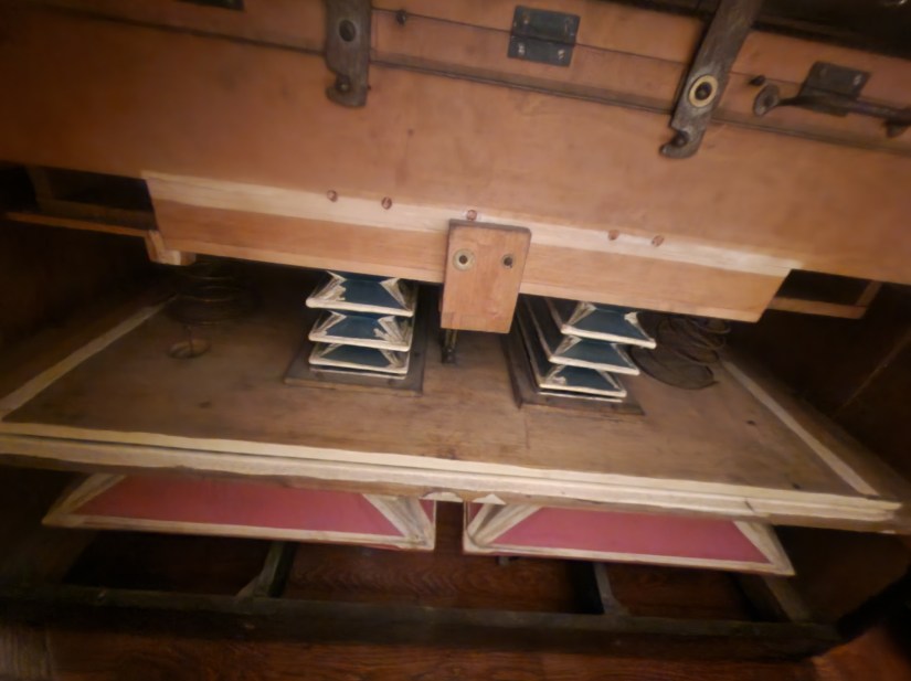 Le jeu doux correspond au basson (8 pieds) et le cor anglais est un jeu de 4 pieds. A droite deux jeux de 16 pieds (hautbois et clarinette) et un jeu de 4 pieds (flageolet). Seule la flûte est en 8 pieds.
